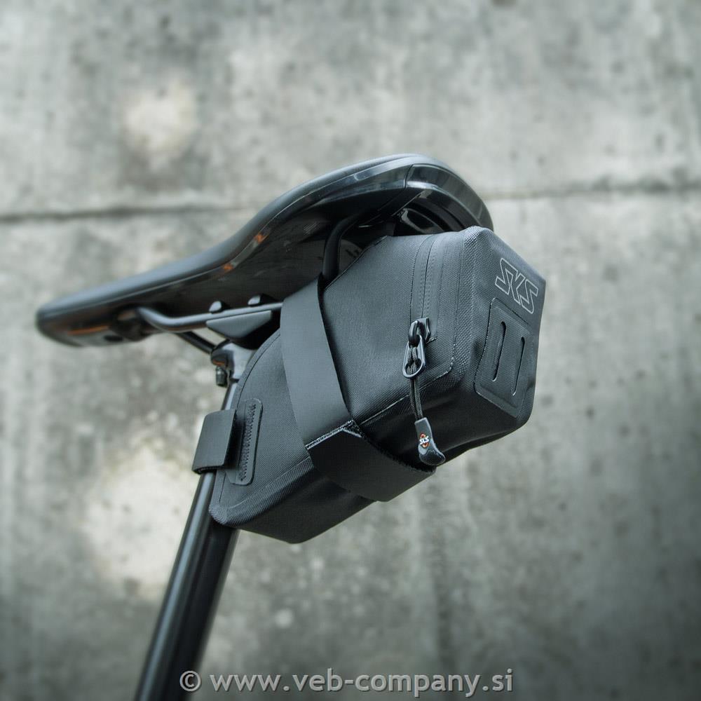 Nizkoprofilna zasnova se neopazno prilega pod sedež, kar zmanjšuje zračni upor in ohranja estetski videz kolesa. Varjeni šivi in vodotesna zadrga z Easyzip funkcijo ščitijo vsebino pred dežjem in umazanijo. Zadnja stran omogoča pritrditev lučke. torbica se pritrdi pod sedež kolesa z nedrsečim Velcro trakom.
